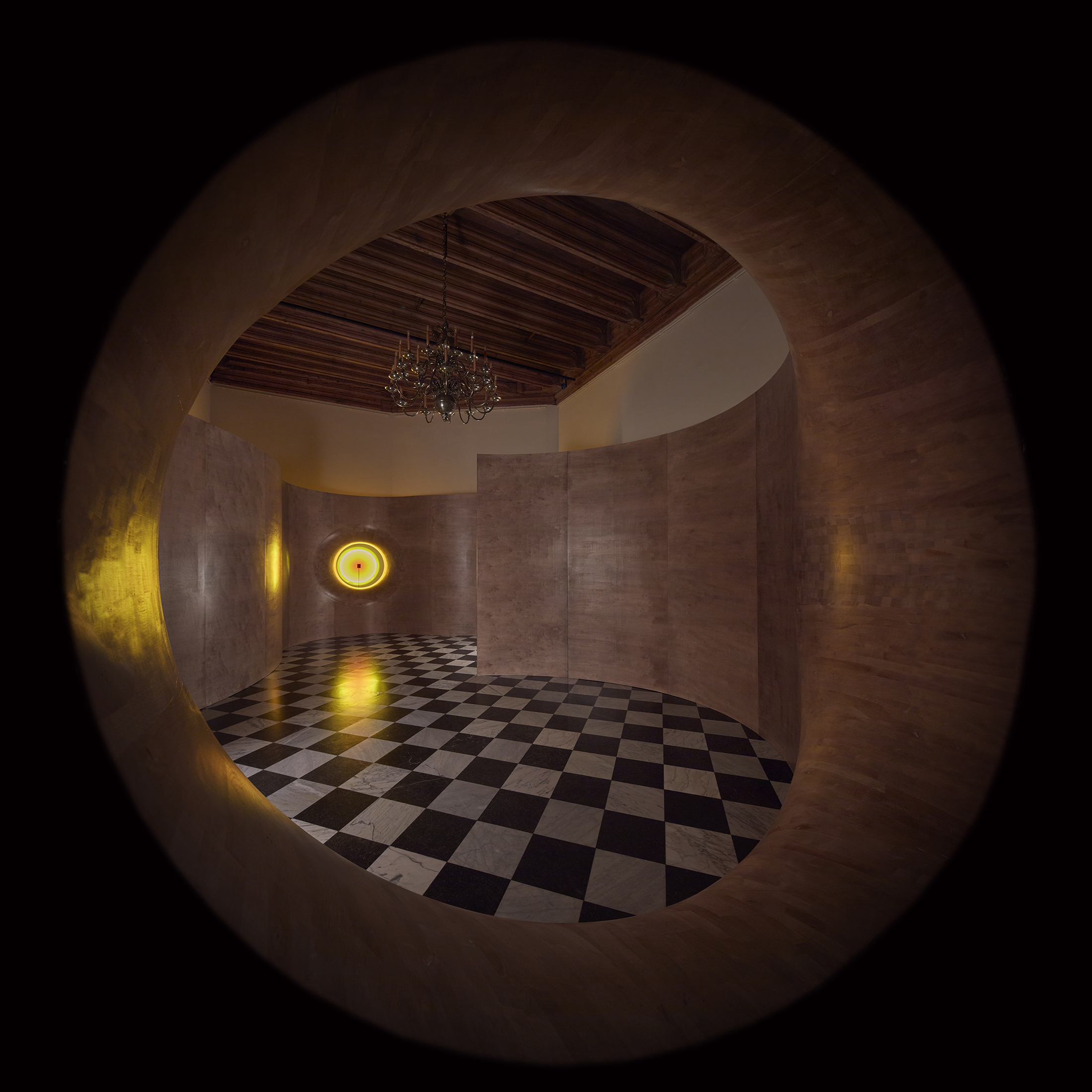 Kształt tego lekkiego parawanu inspirowany był pojedynczą swobodną kreską widoczną z bliska na szkicach, obrazach i rycinach wykonanych przez Rembrandta. W wolno stojącej ścianie ze sklejki wycięto dwa owalne otwory – okna – pośrednią inspiracją dla ich powstania był Autoportret z dwoma kołami (1665-1668) Rembrandta. Za większym z okien umieszczono główną atrakcję wystawy – obraz Polski jeździec (1655). Otaczający go owalny, wygięty na zewnątrz kształt przestrzennego passe-partout z litego drewna mógł przywodzić na myśl iluzoryczny efekt „wciągnięcia” widza w zagadkową historię przedstawioną na płótnie. W związku z tym, że obraz powieszony był na cofniętej wgłąb ścianie, można też zaryzykować stwierdzenie, że był on kolejnym oknem – do świata sztuki oraz wyobraźni Rembrandta
