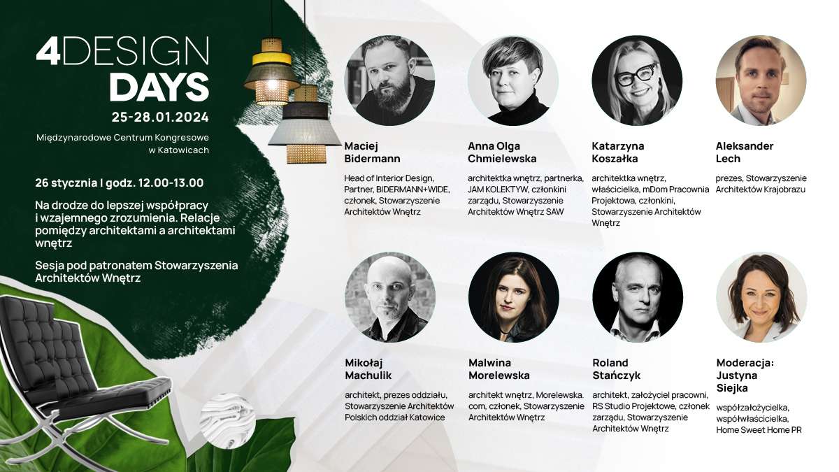 Podczas tegorocznego 4 Design Days odbyła się sesja dyskusyjna pod patronatem naszego stowarzyszenia. Wzięli w niej udział Członkowie SAW (Anna Olga Chmielewska, Roland Stańczyk, Malwina Morelewska, Katarzyna Koszałka), a także Mikołaj Machulik (architekt, prezes oddziału SARP Katowice) i Aleksander Lech, prezes Stowarzyszenie Architektury Krajobrazu.